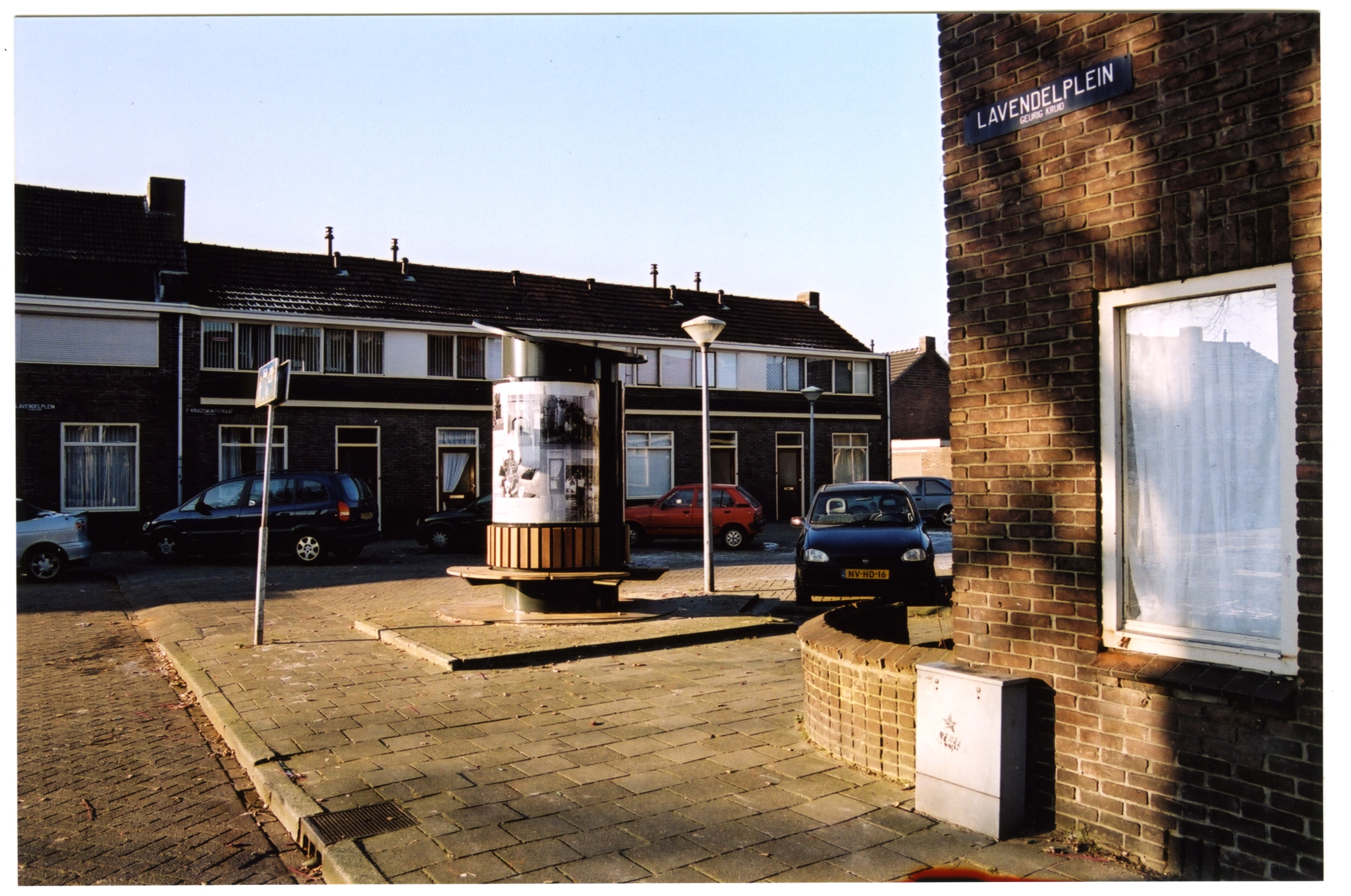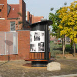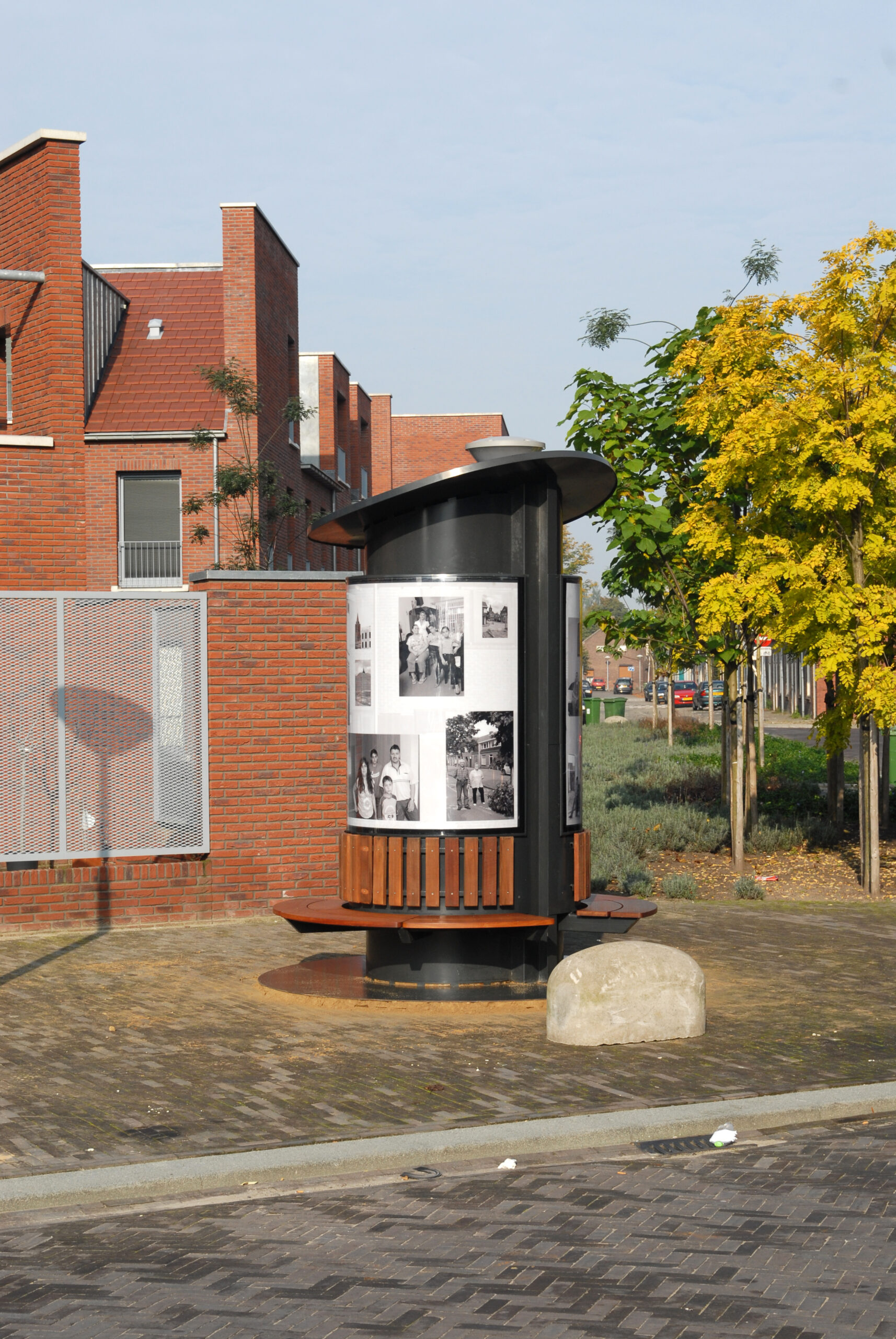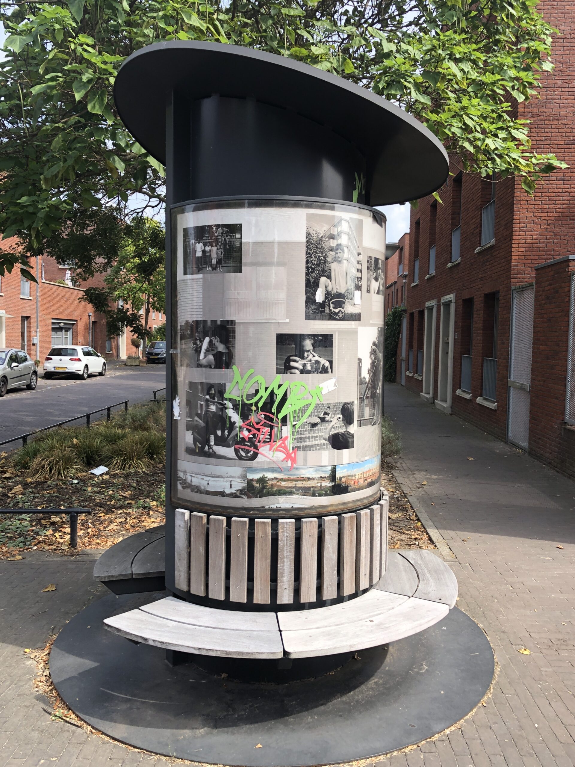 Nadat de gemeente Eindhoven een grote investering heeft gedaan in de Flying Pins van Claes Oldenburg aan de Kennedylaan, ontstond er de vraag om ook een opdracht voor lokale kunstenaars. In 1998 is er het initiatief van de commissie Stadbeeld: Kunst in de buurt. Dus ook Kunst in de Kruidenbuurt. Ik schreef in op de prijsvraag. Nu is het natuurlijk een moeilijke zaak om een kunstobject te projecteren in een buurt die men binnen afzienbare tijd voor het grootste gedeelte gaat slopen en waarvan men nog niet precies weet hoe die er straks uit gaat zien. Mijn idee was een verplaatsbare fotozuil met zitbank en met de foto’s een beeld te geven hoe de buurt er qua bouw nu uitzag en van haar bewoners. De bouw zal in fases verlopen dus de zuil, zal ook met regelmaat verplaatst worden en voorzien van nieuw beeldmateriaal. De zuil is geplaatst in 2001 en verplaatst in 2003, 2007 en 2010.