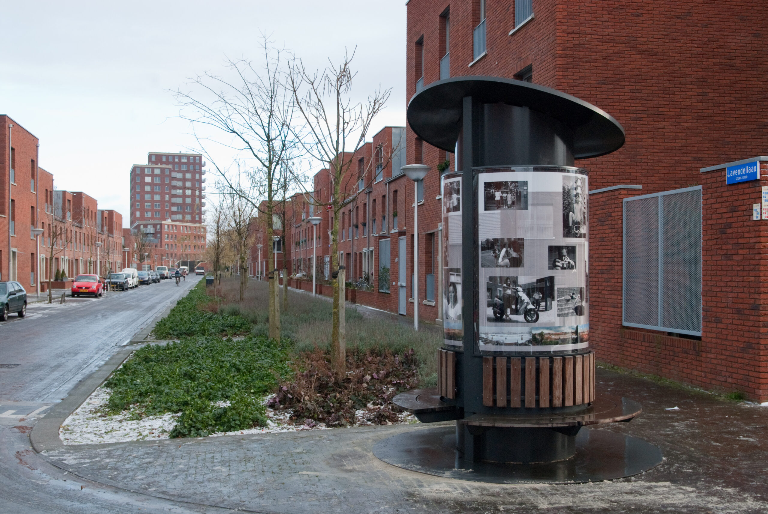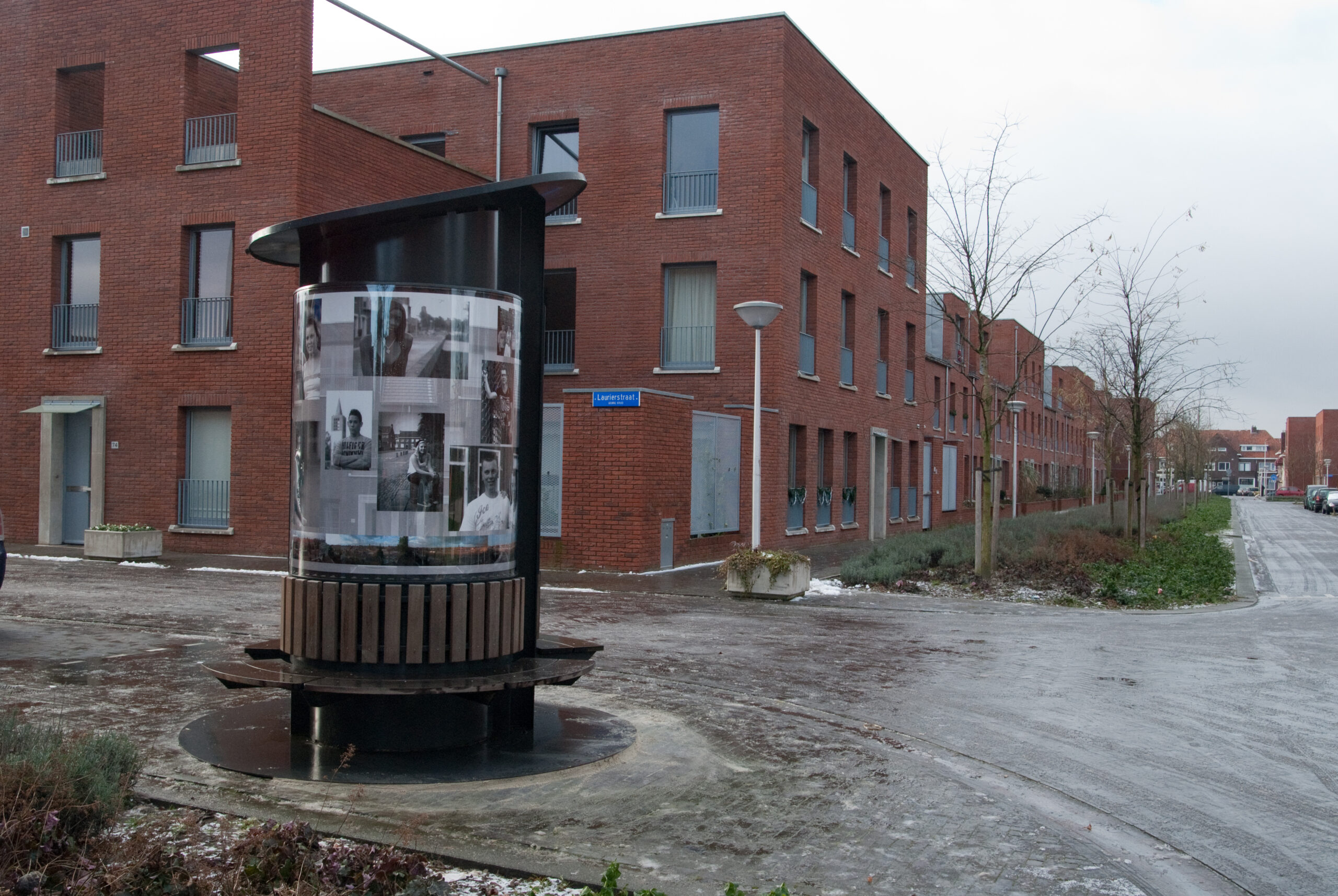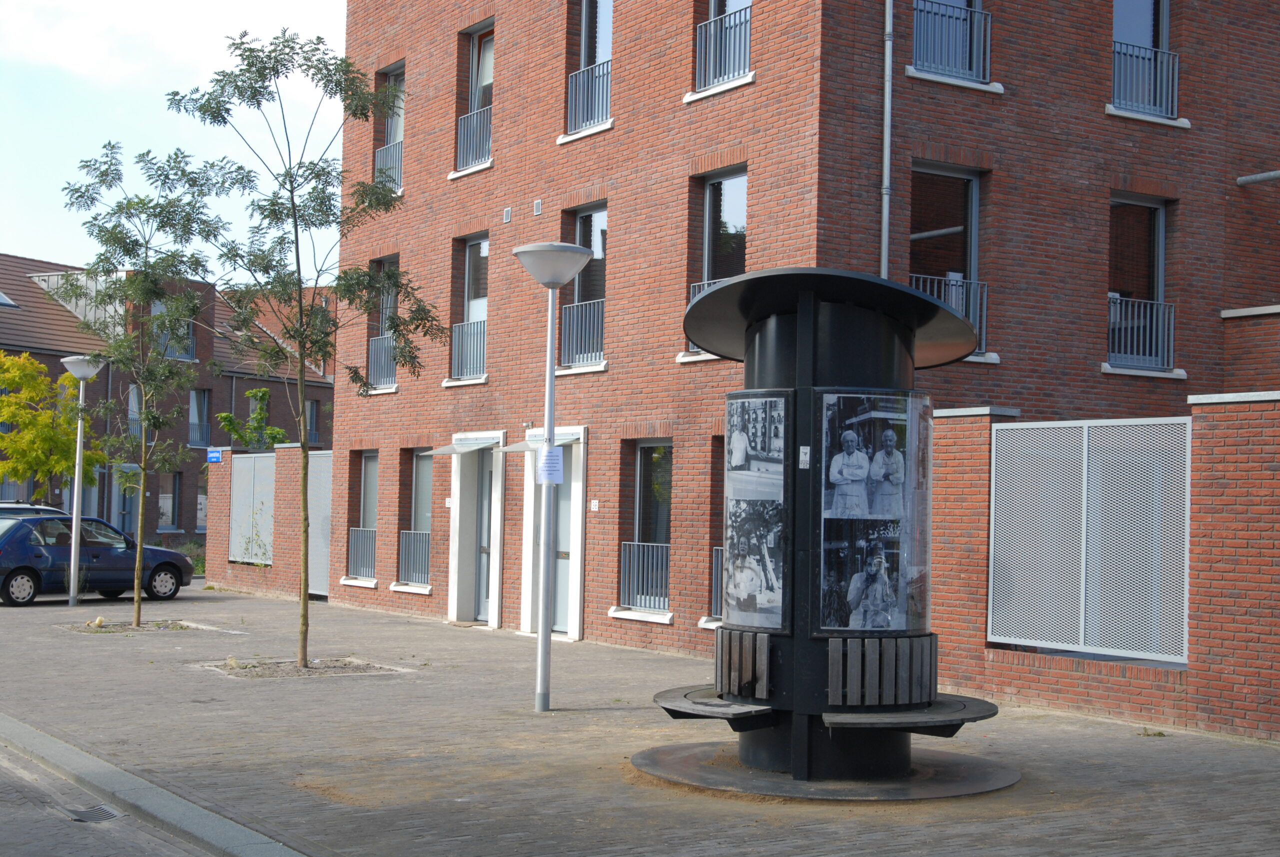 Nadat de gemeente Eindhoven een grote investering heeft gedaan in de Flying Pins van Claes Oldenburg aan de Kennedylaan, ontstond er de vraag om ook een opdracht voor lokale kunstenaars. In 1998 is er het initiatief van de commissie Stadbeeld: Kunst in de buurt. Dus ook Kunst in de Kruidenbuurt. Ik schreef in op de prijsvraag. Nu is het natuurlijk een moeilijke zaak om een kunstobject te projecteren in een buurt die men binnen afzienbare tijd voor het grootste gedeelte gaat slopen en waarvan men nog niet precies weet hoe die er straks uit gaat zien. Mijn idee was een verplaatsbare fotozuil met zitbank en met de foto’s een beeld te geven hoe de buurt er qua bouw nu uitzag en van haar bewoners. De bouw zal in fases verlopen dus de zuil, zal ook met regelmaat verplaatst worden en voorzien van nieuw beeldmateriaal. De zuil is geplaatst in 2001 en verplaatst in 2003, 2007 en 2010.